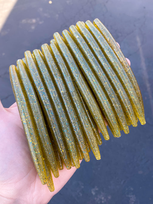 View full detailsObee 6" Finesse Worm – Custom Green Pumpkin w/ Black, Gold & Blue Flake + Pearl Highlight (24-Count Bulk Pack)